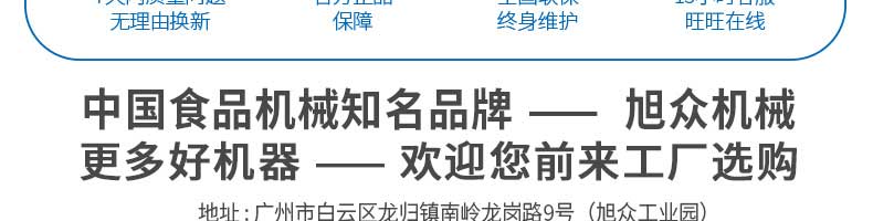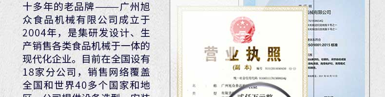 廣州旭眾食品機械有限公司是一家集科研開發(fā),生產(chǎn)設計,營銷服務為一體的現(xiàn)代化生產(chǎn)企業(yè)。現(xiàn)代化生產(chǎn)車間,精湛制造技術,所產(chǎn)機械歷經(jīng)市場重重考驗,不斷贏得海內(nèi)外客戶的贊譽。