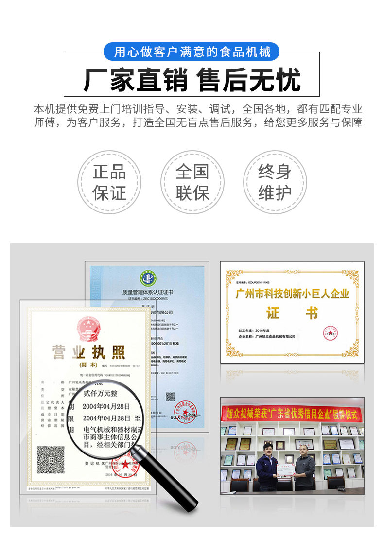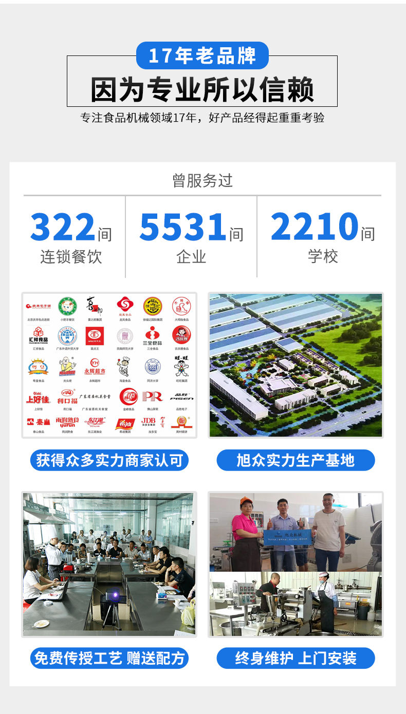 廣州旭眾食品機(jī)械有限公司是一家集科研開(kāi)發(fā),生產(chǎn)設(shè)計(jì),營(yíng)銷(xiāo)服務(wù)為一體的現(xiàn)代化生產(chǎn)企業(yè)?,F(xiàn)代化生產(chǎn)車(chē)間,精湛制造技術(shù),所產(chǎn)機(jī)械歷經(jīng)市場(chǎng)重重考驗(yàn),不斷贏得海內(nèi)外客戶(hù)的贊譽(yù)。