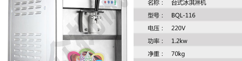 BQL-116臺(tái)式冰淇淋機(jī),●選用國際名牌成熟制冷配套件和高效壓縮機(jī),融合旭眾精湛工藝輔以嚴(yán)格的質(zhì)量控制流程,使產(chǎn)品整體性能及品質(zhì)得以全面提升?!癫捎萌珨?shù)字電腦控制系統(tǒng),選用名牌優(yōu)質(zhì)電器元件,先進(jìn)的生產(chǎn)工藝,故障診斷,軟硬任意調(diào)制,自動(dòng)修復(fù)功能,安全精確,可靠性更高?!駥I(yè)成熟制冷系統(tǒng)設(shè)計(jì),選用世界名牌大功率專用壓縮機(jī),大大縮短冰淇淋成型時(shí)間,相同時(shí)間內(nèi)冰淇淋產(chǎn)量大幅度增加,使您生意火爆時(shí)依然得心應(yīng)手,為您創(chuàng)造財(cái)富?!癜踩椒€(wěn)的機(jī)械攪拌系統(tǒng),噪音更低、振動(dòng)更小,使整機(jī)運(yùn)行性能達(dá)到國際先進(jìn)水平?!翊_保進(jìn)料溫度在0°C~35°C;環(huán)境溫度5°C~40°C勻可正常使用。