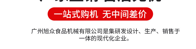 廣州旭眾食品機(jī)械有限公司是一家集科研開發(fā),生產(chǎn)設(shè)計(jì),營(yíng)銷服務(wù)為一體的現(xiàn)代化生產(chǎn)企業(yè)?,F(xiàn)代化生產(chǎn)車間,精湛制造技術(shù),所產(chǎn)機(jī)械歷經(jīng)市場(chǎng)重重考驗(yàn),不斷贏得海內(nèi)外客戶的贊譽(yù)。