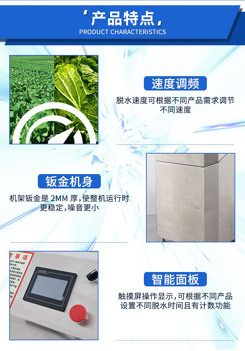 XZ-50型脫水機(jī),蔬菜脫水食品甩干,變頻控制、方便快捷。速度調(diào)頻,脫水速度可根據(jù)不同產(chǎn)品需求調(diào)節(jié)不同速度。鈑金機(jī)身,機(jī)架鈑金是 2MM 厚,使整機(jī)運(yùn)行時(shí)更穩(wěn)定,噪音更小。