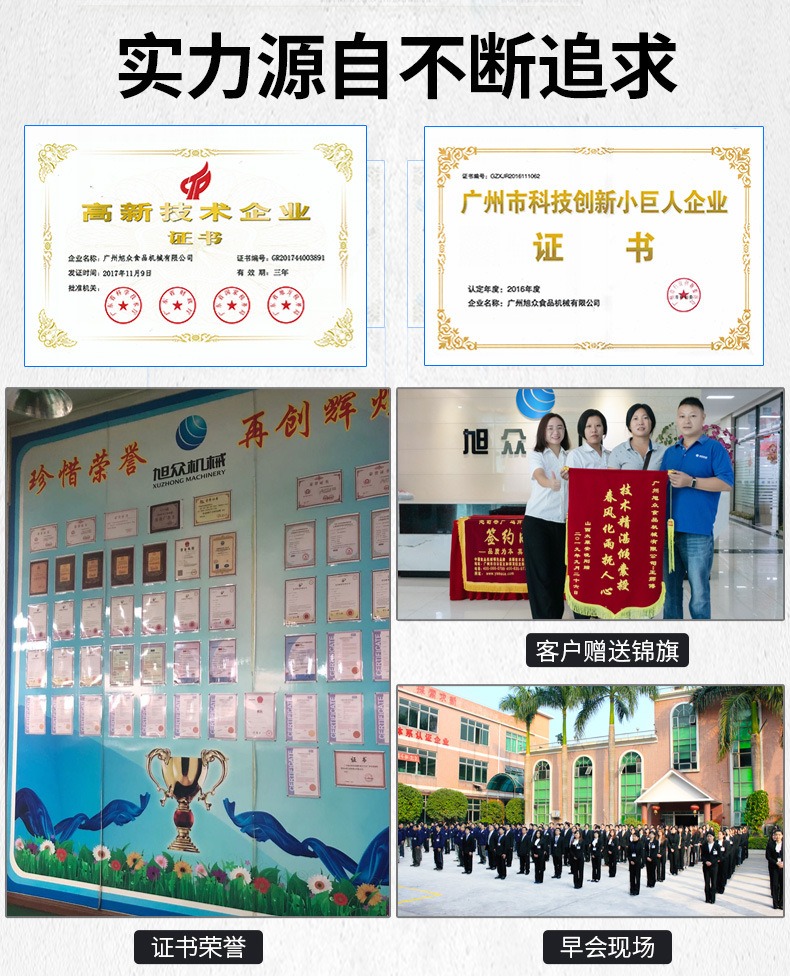 廣州旭眾食品機(jī)械有限公司是一家集科研開(kāi)發(fā),生產(chǎn)設(shè)計(jì),營(yíng)銷服務(wù)為一體的現(xiàn)代化生產(chǎn)企業(yè)?,F(xiàn)代化生產(chǎn)車間,精湛制造技術(shù),所產(chǎn)機(jī)械歷經(jīng)市場(chǎng)重重考驗(yàn),不斷贏得海內(nèi)外客戶的贊譽(yù)。