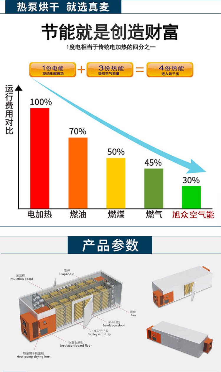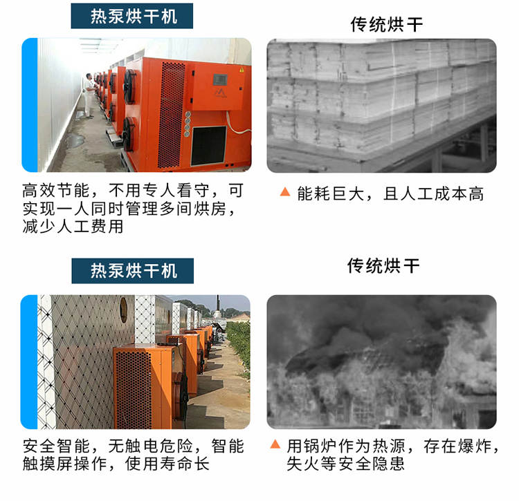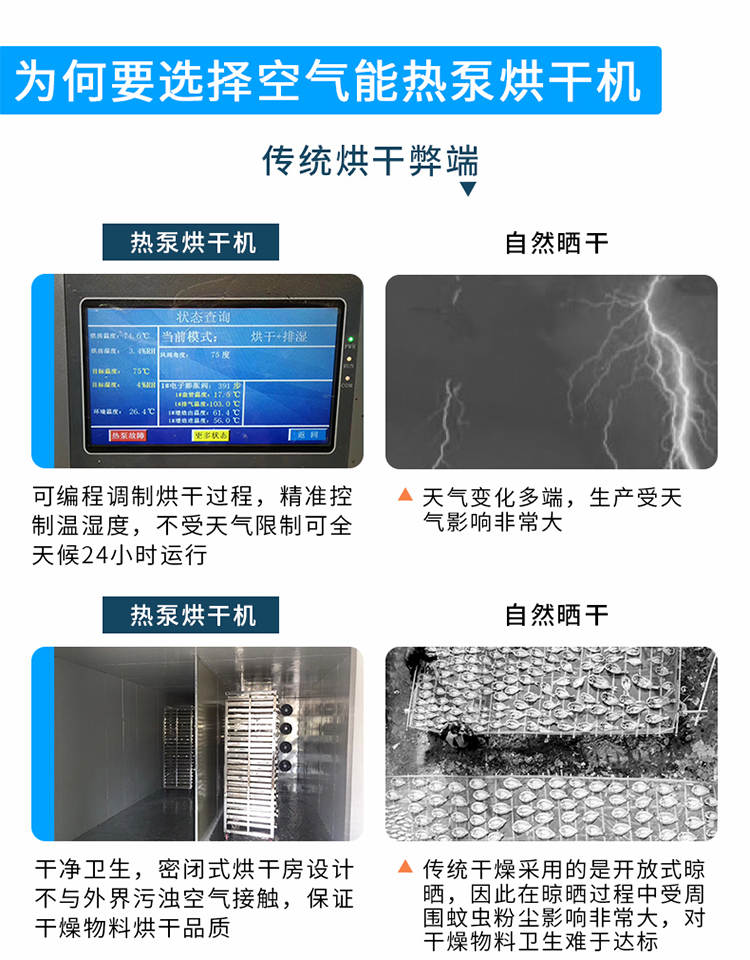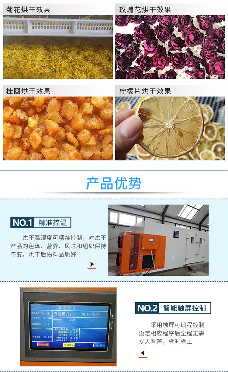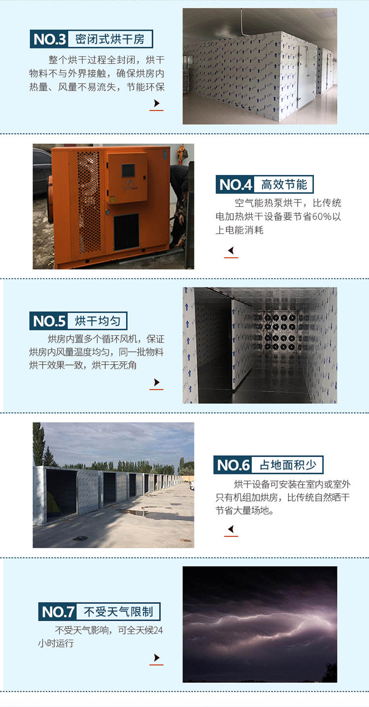 030S-T-KD06空氣能烘干機(jī),可編程調(diào)制烘干過程,精準(zhǔn)控制溫濕度,不受天氣限制可全天候24小時運行。干凈衛(wèi)生,密閉式烘干房設(shè)計不與外界污濁空氣接觸,保證干燥物料烘干品質(zhì)。高效節(jié)能,不用專人看守,可實現(xiàn)一人同時管理多間烘房減少人工費用