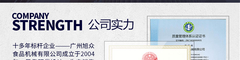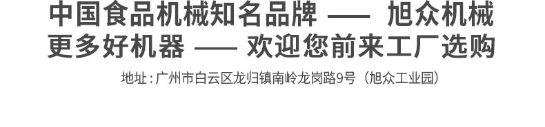 廣州旭眾食品機械有限公司是一家集科研開發(fā),生產(chǎn)設計,營銷服務為一體的現(xiàn)代化生產(chǎn)企業(yè)?,F(xiàn)代化生產(chǎn)車間,精湛制造技術(shù),所產(chǎn)機械歷經(jīng)市場重重考驗,不斷贏得海內(nèi)外客戶的贊譽。