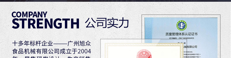 廣州旭眾食品機(jī)械有限公司是一家集科研開發(fā),生產(chǎn)設(shè)計(jì),營(yíng)銷服務(wù)為一體的現(xiàn)代化生產(chǎn)企業(yè)?,F(xiàn)代化生產(chǎn)車間,精湛制造技術(shù),所產(chǎn)機(jī)械歷經(jīng)市場(chǎng)重重考驗(yàn),不斷贏得海內(nèi)外客戶的贊譽(yù)。