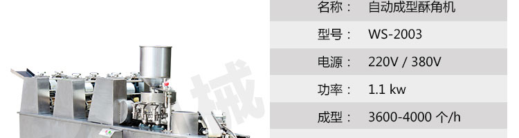 WS-2003 型自動(dòng)成型酥角機(jī)(油餃機(jī)),適用于制作酥角、油餃,可包的餡有:花生、椰蓉、白糖等。適合多種面粉材料、并且成型封口美觀牢固。小模約47mm,大模約57mm隨機(jī)標(biāo)配一套模具。購(gòu)機(jī)贈(zèng)送工藝配方。