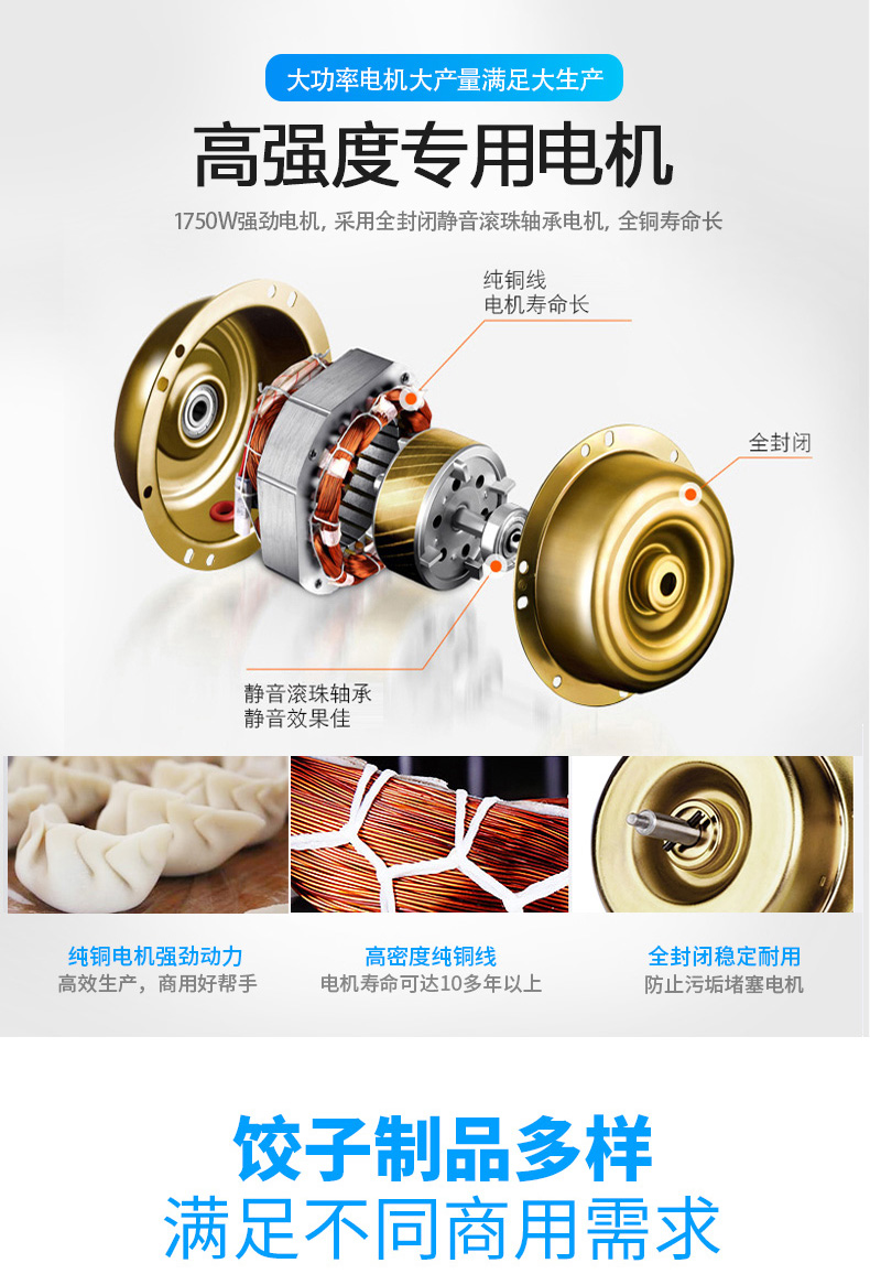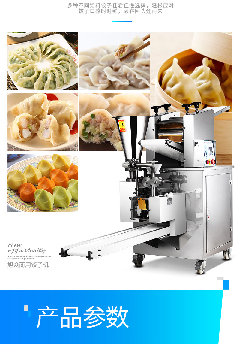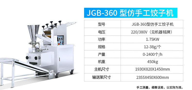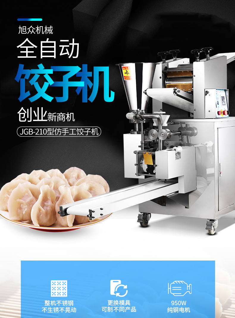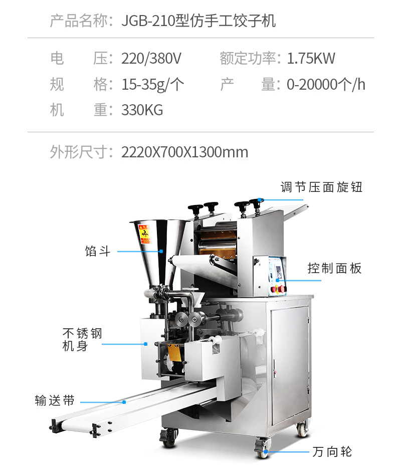 JGB-210型仿手工餃子機,本機采用自動壓面皮包餃子的新工藝技術,本機可生產速凍餃子等,能生產各種肉餡、肉菜混合餡、全菜餡及其他種餡的餃子,適用于餃子館、食品生產廠家、賓館、飯店、餐廳、團體食堂、學校、部隊。免費上門安裝調試,贈送面點工藝