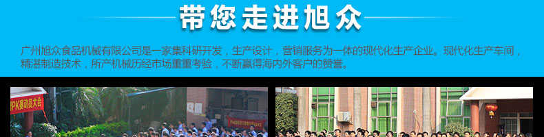 廣州旭眾食品機(jī)械有限公司是一家集科研開發(fā),生產(chǎn)設(shè)計(jì),營(yíng)銷服務(wù)為一體的現(xiàn)代化生產(chǎn)企業(yè)?,F(xiàn)代化生產(chǎn)車間,精湛制造技術(shù),所產(chǎn)機(jī)械歷經(jīng)市場(chǎng)重重考驗(yàn),不斷贏得海內(nèi)外客戶的贊譽(yù)。