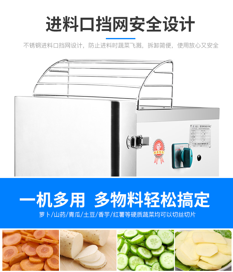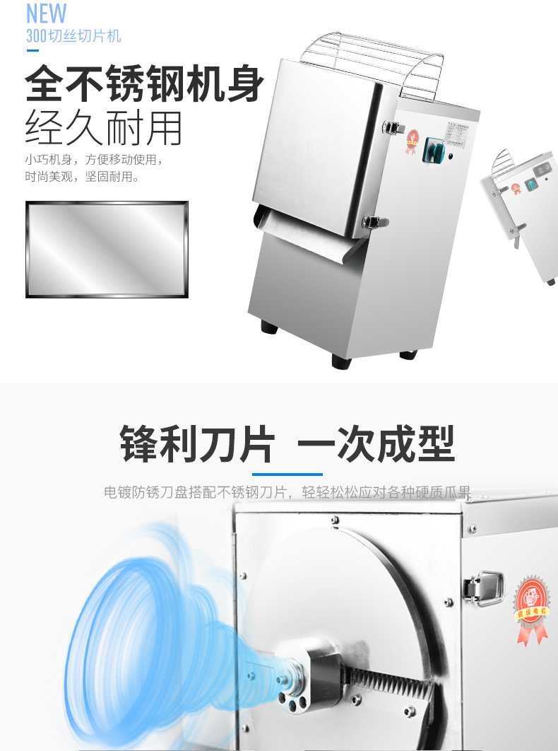 300型瓜果切絲切片機,高效便捷、一次成型、每小時可切200-300KG。全不銹鋼機身經(jīng)久耐用小巧機身,方便移動使用,時尚美觀,堅固耐用。鋒利刀片、一次成型。電鍍防銹刀盤搭配不銹鋼刀片,輕輕松松應對各種硬質(zhì)瓜果。