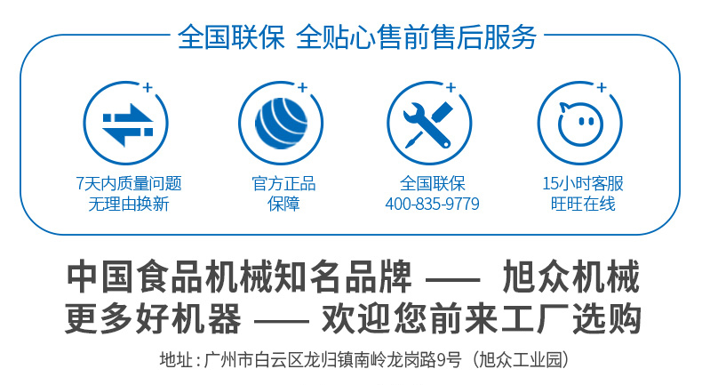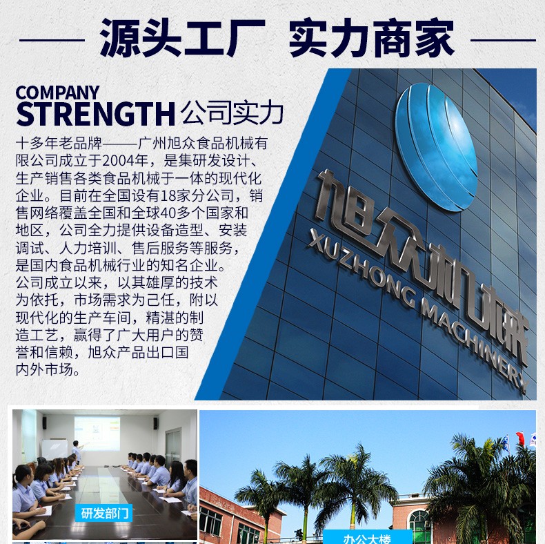 廣州旭眾食品機械有限公司是一家集科研開發(fā),生產(chǎn)設計,營銷服務為一體的現(xiàn)代化生產(chǎn)企業(yè)?,F(xiàn)代化生產(chǎn)車間,精湛制造技術(shù),所產(chǎn)機械歷經(jīng)市場重重考驗,不斷贏得海內(nèi)外客戶的贊譽。
