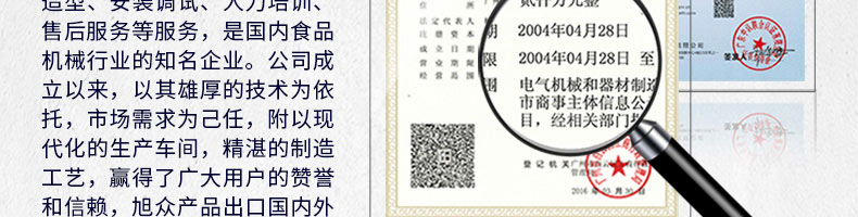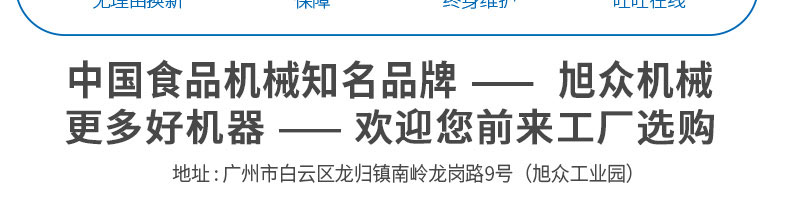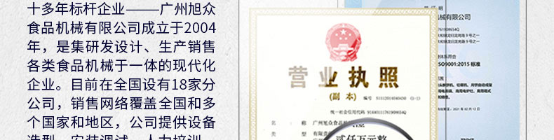 廣州旭眾食品機(jī)械有限公司是一家集科研開發(fā),生產(chǎn)設(shè)計,營銷服務(wù)為一體的現(xiàn)代化生產(chǎn)企業(yè)?,F(xiàn)代化生產(chǎn)車間,精湛制造技術(shù),所產(chǎn)機(jī)械歷經(jīng)市場重重考驗,不斷贏得海內(nèi)外客戶的贊譽(yù)。