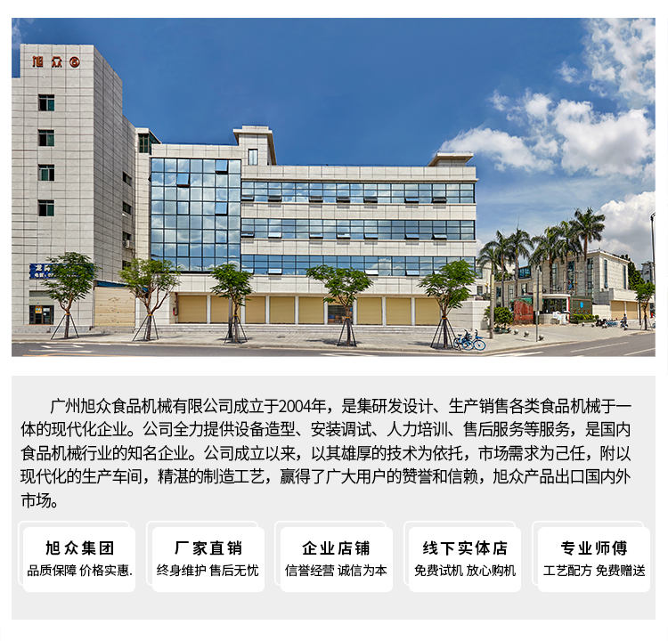廣州旭眾食品機械有限公司是一家集科研開發(fā),生產(chǎn)設(shè)計,營銷服務(wù)為一體的現(xiàn)代化生產(chǎn)企業(yè)?,F(xiàn)代化生產(chǎn)車間,精湛制造技術(shù),所產(chǎn)機械歷經(jīng)市場重重考驗,不斷贏得海內(nèi)外客戶的贊譽。