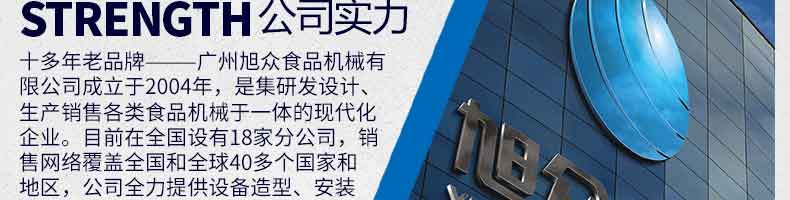 廣州旭眾食品機械有限公司是一家集科研開發(fā),生產(chǎn)設(shè)計,營銷服務(wù)為一體的現(xiàn)代化生產(chǎn)企業(yè)?,F(xiàn)代化生產(chǎn)車間,精湛制造技術(shù),所產(chǎn)機械歷經(jīng)市場重重考驗,不斷贏得海內(nèi)外客戶的贊譽。