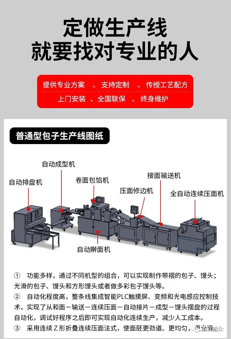 智能包子饅頭生產(chǎn)線,功能多樣,通過不同機(jī)型的組合,可以實(shí)現(xiàn)制作帶褶的包子、饅頭;光滑的包子、饅頭和方形饅頭或者做多彩包子饅頭等。