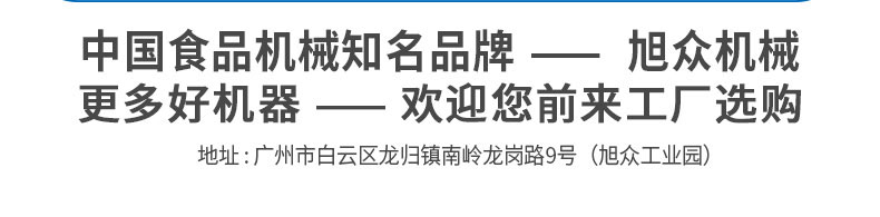 廣州旭眾食品機械有限公司是一家集科研開發(fā),生產(chǎn)設(shè)計,營銷服務(wù)為一體的現(xiàn)代化生產(chǎn)企業(yè)。現(xiàn)代化生產(chǎn)車間,精湛制造技術(shù),所產(chǎn)機械歷經(jīng)市場重重考驗,不斷贏得海內(nèi)外客戶的贊譽。
