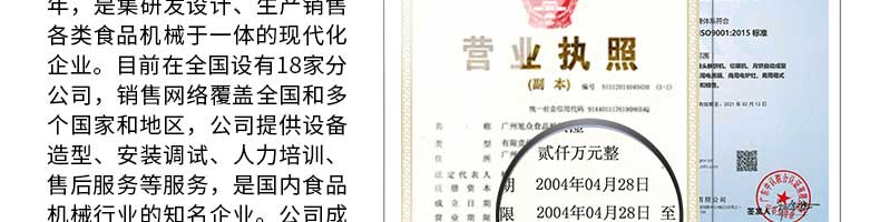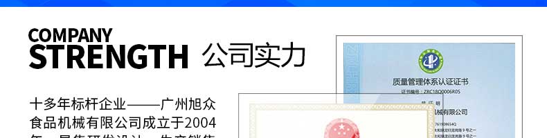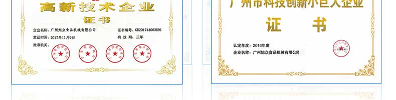 廣州旭眾食品機械有限公司是一家集科研開發(fā),生產設計,營銷服務為一體的現(xiàn)代化生產企業(yè)?,F(xiàn)代化生產車間,精湛制造技術,所產機械歷經市場重重考驗,不斷贏得海內外客戶的贊譽。