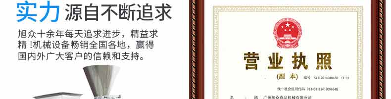 廣州旭眾食品機(jī)械有限公司是一家集科研開(kāi)發(fā),生產(chǎn)設(shè)計(jì),營(yíng)銷服務(wù)為一體的現(xiàn)代化生產(chǎn)企業(yè)?,F(xiàn)代化生產(chǎn)車(chē)間,精湛制造技術(shù),所產(chǎn)機(jī)械歷經(jīng)市場(chǎng)重重考驗(yàn),不斷贏得海內(nèi)外客戶的贊譽(yù)。