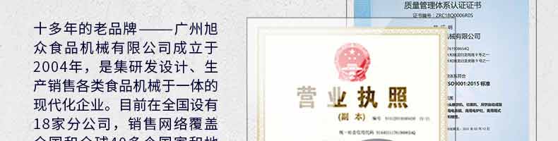 廣州旭眾食品機(jī)械有限公司是一家集科研開發(fā),生產(chǎn)設(shè)計(jì),營銷服務(wù)為一體的現(xiàn)代化生產(chǎn)企業(yè)?,F(xiàn)代化生產(chǎn)車間,精湛制造技術(shù),所產(chǎn)機(jī)械歷經(jīng)市場(chǎng)重重考驗(yàn),不斷贏得海內(nèi)外客戶的贊譽(yù)。